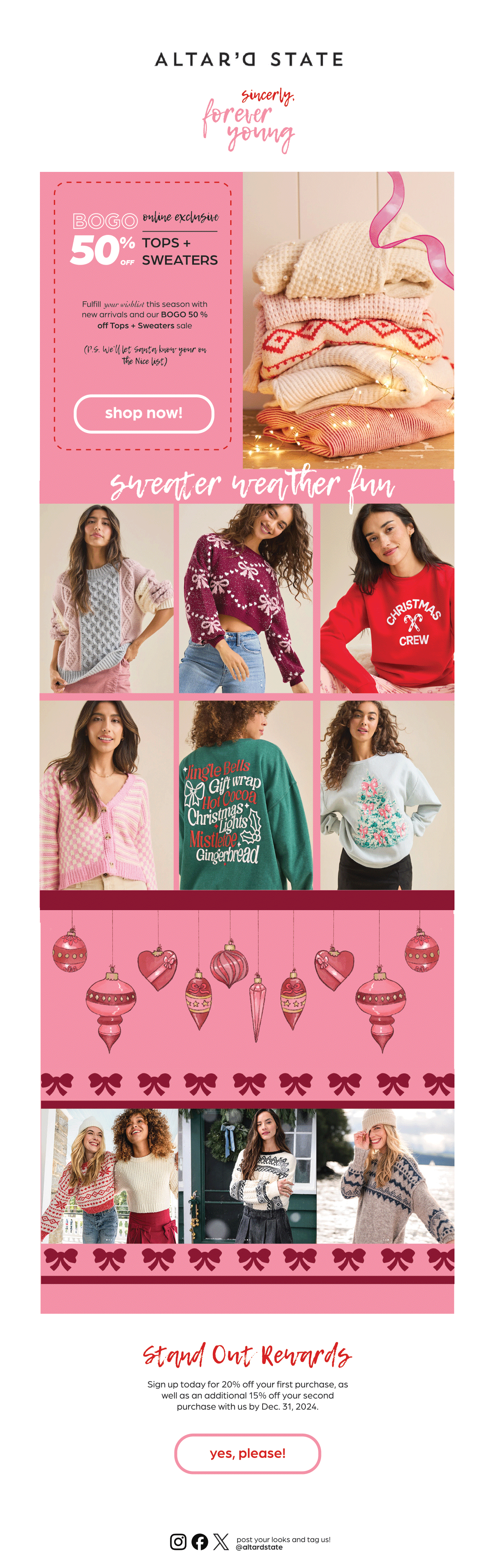 The campaign theme for this catalog was inspired by allowing women to fulfill their “inner child” wishlists. The campaign is designed to be like a giant Christmas wishlist to Santa through a winter cheer and pink aesthetic. The catalog follows the brand identity and style used in previous and current Altar’d State catalog and collateral.